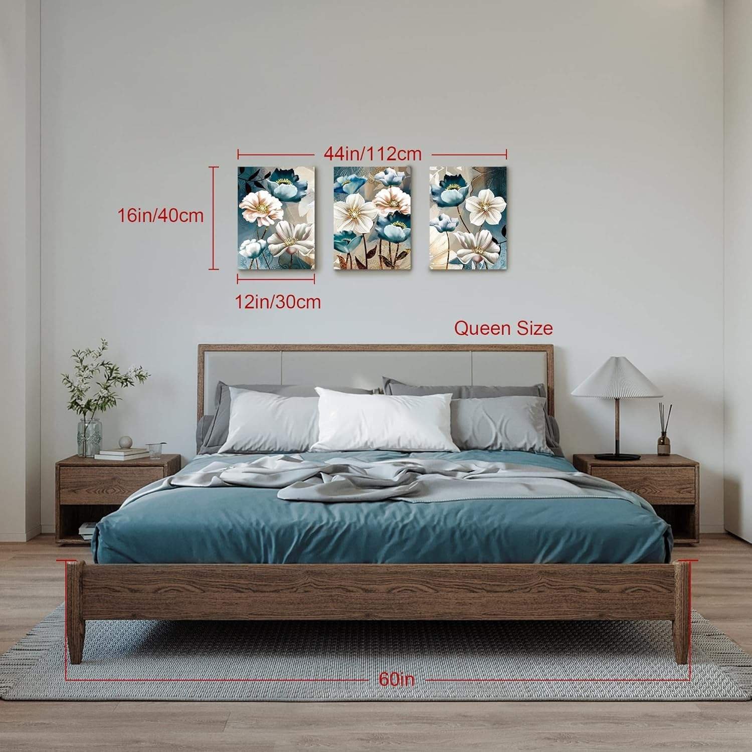 3-piece blue lotus flower canvas wall art set with watercolor floral design. Each panel measures 12″x16″, ideal for living room or bedroom home décor.